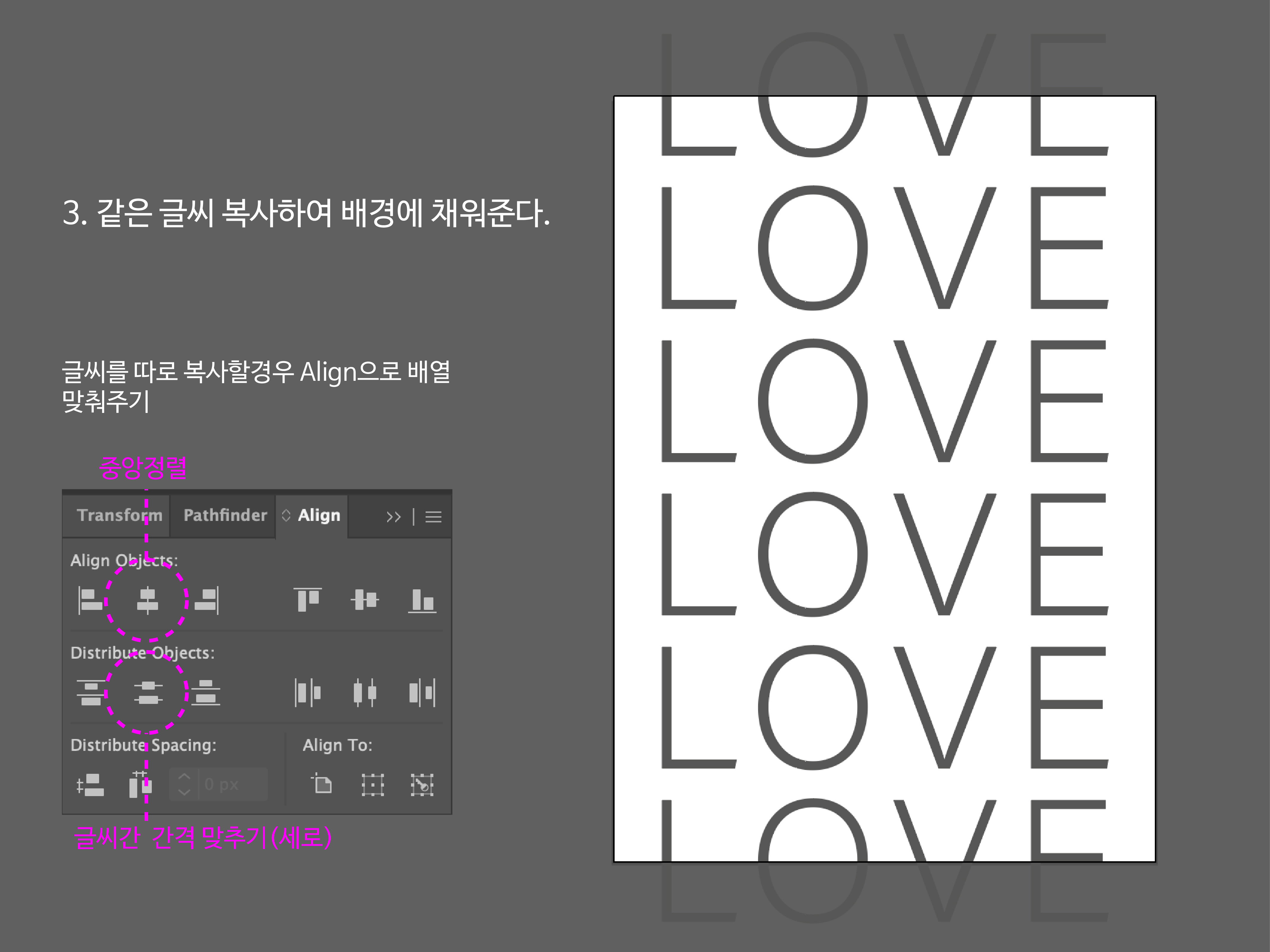 2. 배경에 적당히 채워시도록 글씨 자간을 조절해 주며 밑으로 계속 복사해 준다.