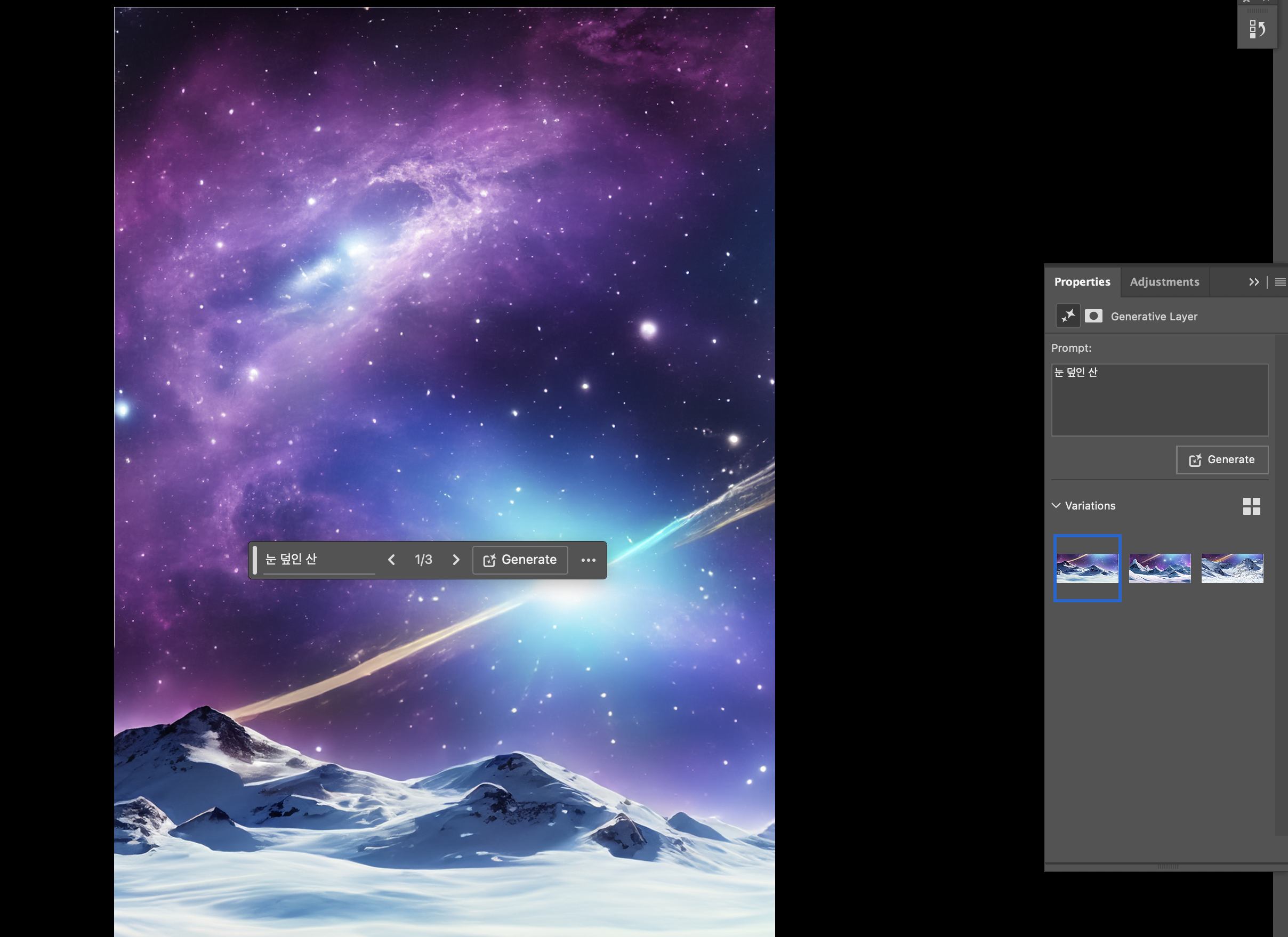 그랬더니 선택한 영역만큼의 눈 덮인 산 이미지가 생성되었습니다.